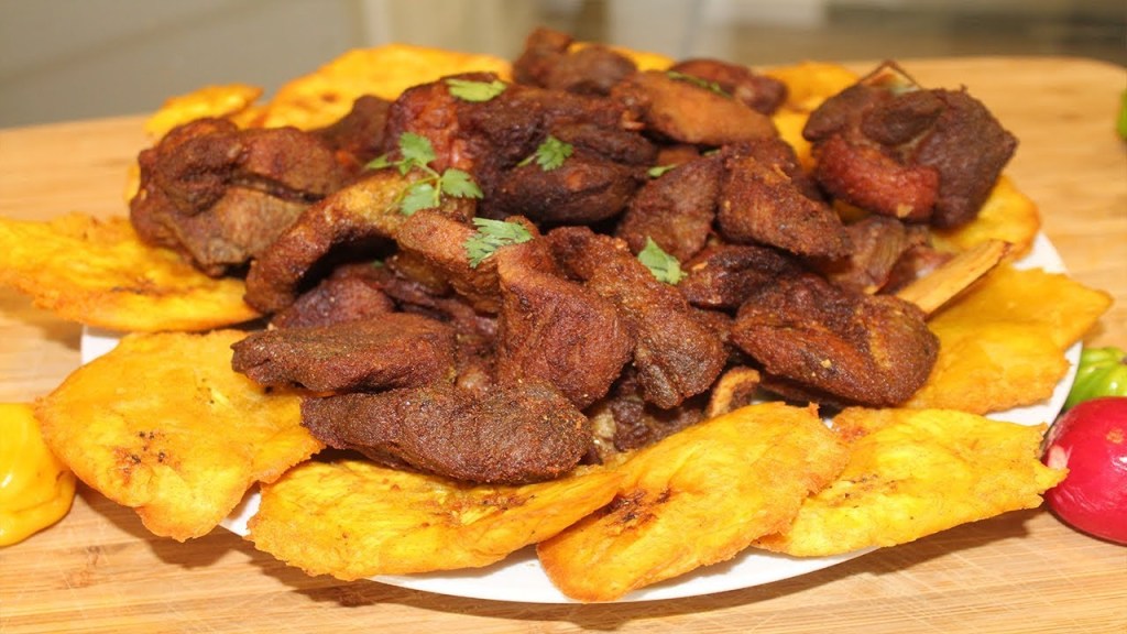 Pour les amoureux de viande. Ce plat est composé de banane pesé et de porc ou de poulet.